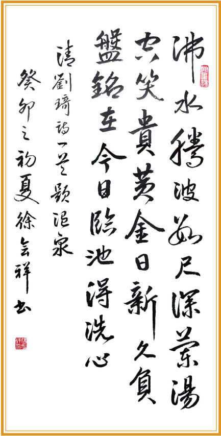 第三句,“日新久负盘铭在”,此句用了一个典故。《盘铭》指古代刻在盥洗盘器上的劝戒文辞。相传,商代开国之君商汤有一件盥手盘,上面刻有《盘铭》:“苟日新,日日新,又日新。”这句《盘铭》的意思是,不仅每日要深入地思考如何求新、革新、创新的方法,而且每日还要主动地宣传和说服人们向往求新、革新、创新的愿景,更要每日以身作则积极地带领人们共同去行动、实践。《盘铭》还在,却没有去践行日日新的劝诫文辞。真是有负于这个《盘铭》啊。这句从诗的结构是上一句转折,意思却是上一句的递进。为诗的结尾做铺垫。